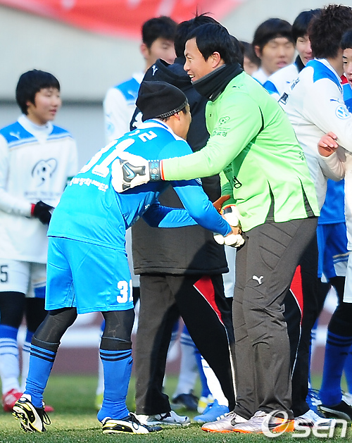 경기를 마치고 희망팀 이수근이 같은팀 이운재 골키퍼와 악수를 나누고 있다./rumi@osen.co.kr