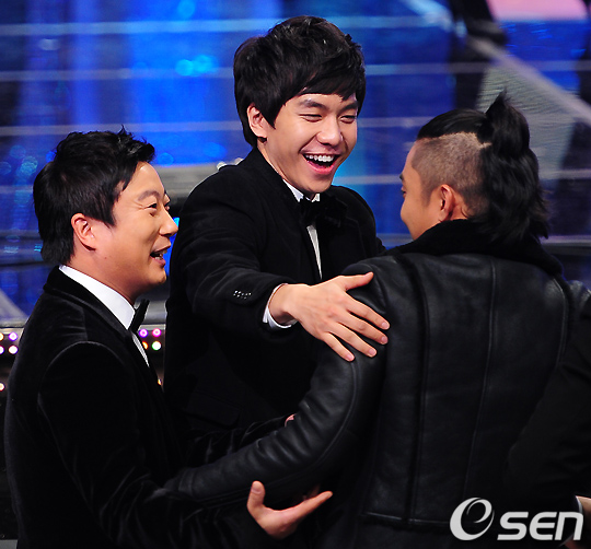 이승기와 이수근이 최고 엔터네이너상 수상자을 수상하게된 은지원을 축하하고 있다./rumi@osen.co.kr