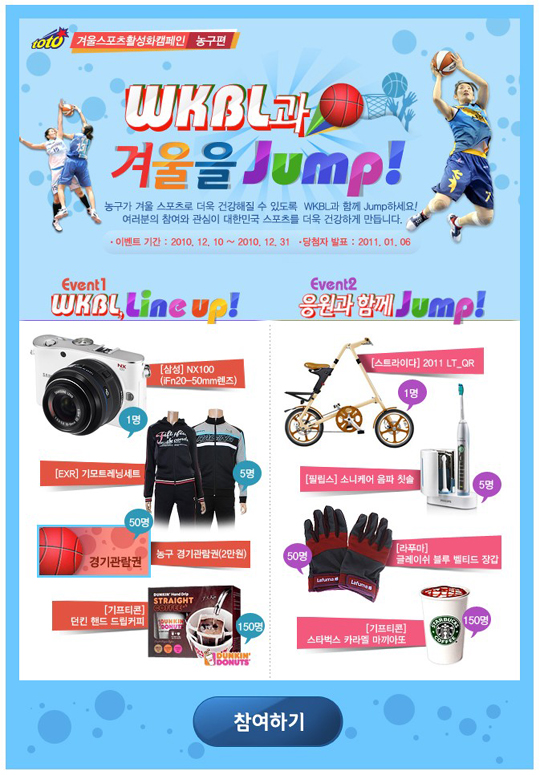 두번째 이벤트인 '응원과 함께 Jump!'의 경우 농구 경기장에서 찍은 응원사진이나 본인이 함께 나온 경기장 사진을 올리면 된다. 참가자들은 추첨을 통해 자전거(1명), 전동칫솔(5명), 장갑(50명), 커피 기프티콘(150명) 등을 증정한다.