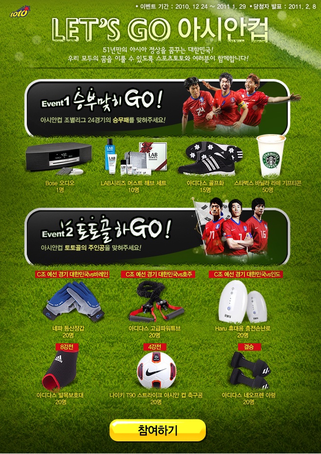 '토토골하GO!' 이벤트는 전반 15분 이내 첫 번째 골을 기록할 우리나라 선수를 맞히면 된다. 한국팀이 속한 C조 예선인 1월 11일 대한민국-바레인전, 14일 대한민국-호주전, 18일 대한민국-인도전을 대상으로 이벤트가 진행되고, 경기 시작 10분전까지 참여가 가능하다. 참가자들을 대상으로 추첨을 통해 등산장갑(20명), 파워튜브(20명), 휴대용 충전손난로(20명) 등을 경품으로 제공한다.
