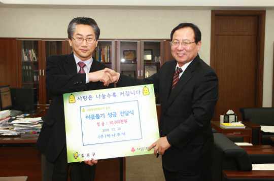 하나투어는 지난 20일 종로구청과 서울 사회복지공동모금회가 함께하는 ‘따뜻한 겨울보내기 사업’에 1000만원의 성금을 전달, 종로구청 내 독거노인, 소년소녀가장, 저소득 주민들을 위한 생계비와 의료비를 지원했다. 이에 앞서 KBS 등 방송 3사를 통해 연평도 피해주민 복구지원과 소외계층을 돕기 위한 성금 6000만원을 전국재해구호협회와 사회복지공동모금회에 기탁하기도 했다.