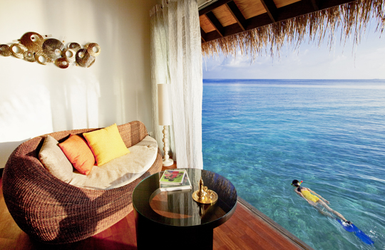 확 트인 개인공간과 멋진 전망을 지닌 워터 방갈로의 최대 장점은 옥색의 라군이다. 다양한 블루 계통의 물감을 흩뿌려 놓은 듯한 라군에서 스노쿨링 하는 재미는 어떤 다른 오락과도 비교되지 않는다. 특히 객실 선덱에서 바로 라군으로 내려가는 계단이 있어 언제든지 바다 속 주인공이 될 수 있다.