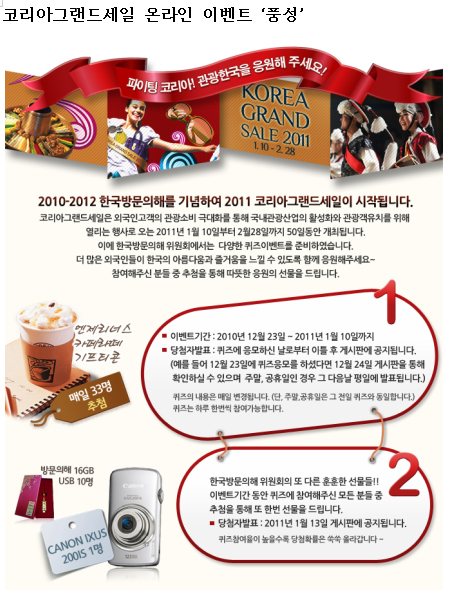 (재)한국방문의해위원회가 오는 2011년 1월 10일부터 2월 28일까지 53일간 펼쳐지는 ‘2011 코리아그랜드세일’을 기념하기 위해 온라인 이벤트를 실시한다고 밝혔다.