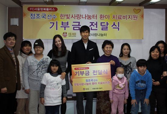 정조국(26, FC 서울)이 27일 오전 서대문구 창천동에 위치한 '한빛사랑나눔터'를 방문해 소아암 어린이들에게 성금을 전달했다.