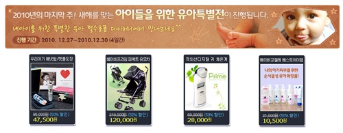 2011년 태어날 아기를 위한 디씨허니의 ‘유아용품 이벤트’는 이미 많은 예비 맘들에게 사랑 받고 있는 제품들로만 구성되어 있어 정보와 유행에 발 빠른 센스 있는 예비 맘들에게 맞춤 이벤트가 되고 있다.