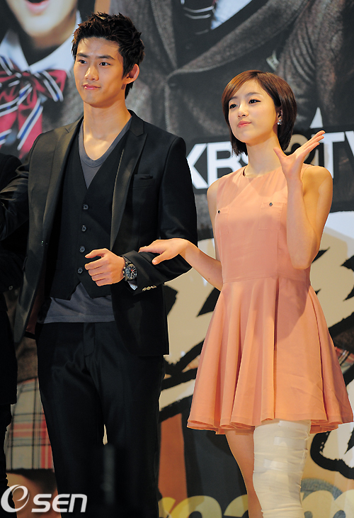 다리 부상을 당한 함은정이 옥택연의 부축을 받으며 포토타임을 갖고 있다. / jpnews@osen.co.kr