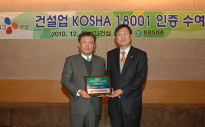 CJ건설은 지난 3월 인증 신청 후 본사와 현장에 대한 공단의 실태분석과 시스템 구축을 위한 기술지원, 컨설팅 등을 통해 안전보건경영시스템을 갖추고 인증을 받게 됐다.