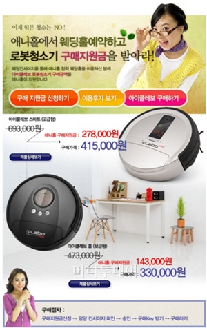 예비신랑, 신부들에게 인기가 많은 로봇청소기는 69만 원대인데, 애니홀에서 웨딩홀을 예약하면 애니홀에서 27만 원 정도의 구매지원금을 지원하여 41만 원대에 소비자는 구매할 수 있다. 약 40% 이상의 할인율이다.