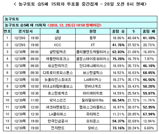 농구토토 승5패 15회차 투표율 중간 집계 결과