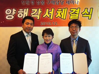 22일 국가법의 엄정한 집행과 투명한 상품구매를 위한 공공기관 친환경 상품 구매 담당자 특별 세미나에 따른 업무 협약식을 가진 친환경 상품제조 협회 이정옥 회장은 “저탄소 녹색 성장의 정부 정책기조는 우리 모두가 함께 참여하고 관심을 갖는 가운데 성장 할 수 있다” 라며 “공공 기관의 체계적인 친환경 상품 사용을 통해 친환경 일류 국가 건설에 앞장 서겠다”고 밝혔다.