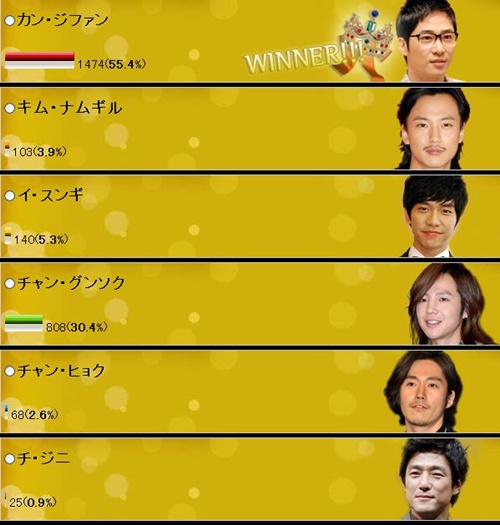 지난 12월 2일부터 12월 20일까지 실시된 이번 설문조사는 일본의 INNOLIFE AWARD에서 진행되었으며 총 2,662명이 참석해 강지환은 압도적으로 55.4% (1,474명)로 1위를 차지했으며 2위 장근석 30.4% (808명), 3위 이승기 5.3%(140명) 4위 김남길 3.9% (103명) 5위 장혁 2.6% (68명) 6위 천정명 1.7% (44명), 7위 지진희 0.9% (25명) 순이다.