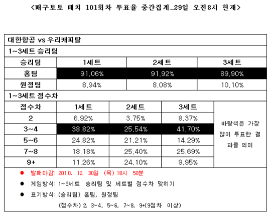 2010-11시즌 프로배구 대상 배구토토 매치 101회차 중간집계 결과