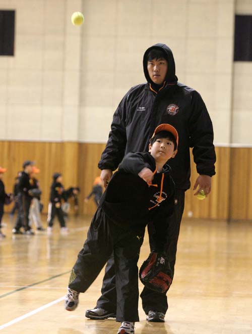 류현진 선수는 12월 비활동기간 동안 3차례 모교를 방문해서 아이들의 훈련모습을 보고 지도를 하고 간식을 제공하기도 했다.