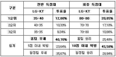 원정팀 KT의 승리를 예상한 참가자는 28.94%로 집계됐고, 나머지 25.48%는 홈팀 LG의 승리를 예상했다. 전반전에서는 홈팀 LG 우세(40.70%)가 원정팀 KT 우세(35.67%), 양 팀 5점 이내 박빙승부(23.64%)를 근소한 차이로 앞섰다. 득점대에서는 전반 35-40점대가 12.80%, 최종 80-80점대 10점 이내 박빙승부가 20.85%로 최다를 차지했다.