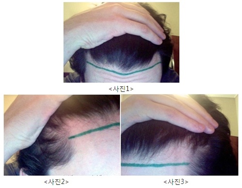 ◈대학생 김모씨 : “20세 남자입니다. 머리를 길러서 모르고 있었는데 머리카락을 자른 후 보니 머리 양쪽 모서리 부분이 점점 탈모가 일어나는 것 같습니다<사진1>. 예전보다 뒤로 간 것 같아요. 초록색으로 그린 선이 전에 제가 있었던 헤어라인 입니다. <사진2>와 <사진3>을 비교해 보면 오른쪽이 탈모가 진행된 것처럼 보입니다. 사진 보시고 조언 부탁 드립니다.”