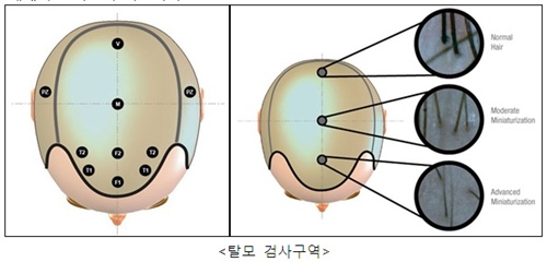 탈모로 고민하고 있다면, 위 그림과 같이 모발을 구역화 하여 나눈 후 각 구역별로 가늘어 짐 혹은 탈모 부위를 확인하여 현재의 탈모 패턴이 어떠한지, 앞으로는 어떻게 진행 될 것인지를 면밀히 살펴 보는 것이 좋다. 이는 지난번 가늘어짐의 시작 포인트와 현재의 시작 포인트를 비교해 얼마나 빠른 속도로 진행되는지 까지도 알 수 있다.