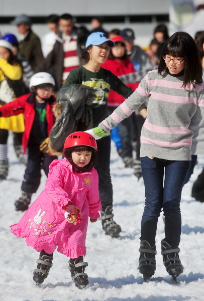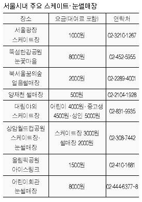 이달 초 첫선을 보인 SH공사 가든파이브 아이스링크(02-2157-4089)는 조명 시설이 잘 돼 있어 야간에 특히 아름답다. 아이스링크가 조성된 가든파이브 라이프관 중앙광장은 3색의 LED 조명이 설치돼 로맨틱한 분위기에서 스케이트를 즐길 수 있다. 스케이트장 외벽에 지휘자 금난새, 뮤지컬 배우 전수경, 설치미술가 한젬마 등 예술가들의 사진과 친필사인, 공연사진 등이 전시돼 볼거리도 가득하다. 내년 2월말까지 연중무휴로 오전 10시부터 오후 10시까지 운영된다. 1회(70분)당 이용료는 고등학생 이하가 1000원, 성인이 2000원. 스케이트를 대여하면 1000원을 더 내야 한다.