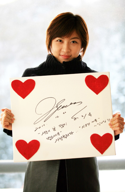 하지원은 촬영장으로 보이는 눈 배경을 뒤로하고 네 귀퉁이에 빨간 하트가 박힌 판넬에 직접 작성한 새해 인사말과 자필 사인을 적어 사랑스런 모습으로 새해 인사를 했다.