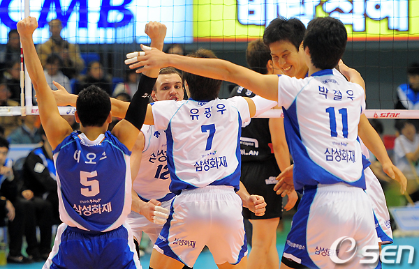 신치용 감독이 이끈 삼성화재가 2일 오후 대전 충무체육관서 열린 NH농협 2010~2011 V리그 2라운드 경기서 가빈이 42점을 올리는 활약에 힘입어 현대캐피탈에 세트 스코어 3-1(19-25 30-28 25-21 25-18)로 역전승했다.