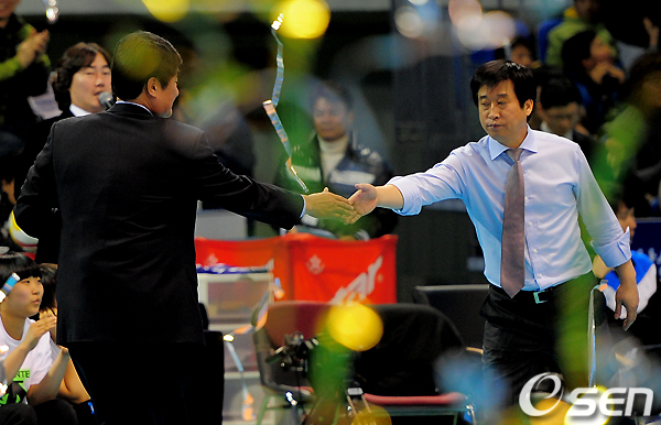 경기후 삼성화재 신치용 감독과 현대캐피탈 김호철 감독이 악수를 하고 있다. /jpnews@osen.co.kr