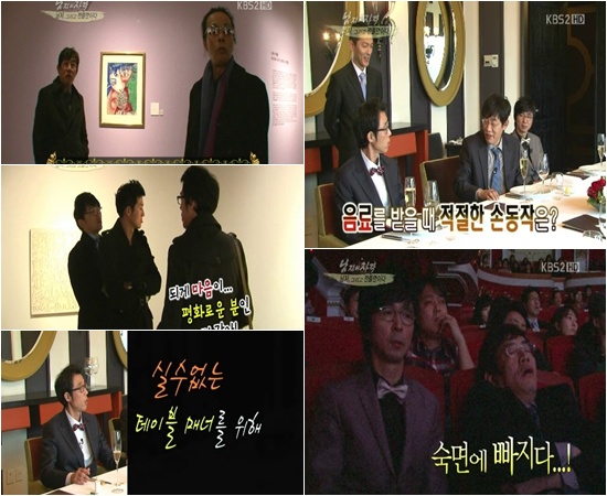 이어 프랜치 레스토랑에 다시 집합한 여섯 멤버들은 프랑스 정통 요리를 맛보며 올바른 식사예절도 배워나갔다. 포크와 나이프의 위치, 잔을 드는 방법, 음식을 먹는 방법 등 그동안 헛갈리거나 잘 몰랐던 식사예절에 대해 알아가며 감탄을 금치 못했다. 식사를 마친 멤버들은 다시 두 팀으로 나뉘어 공연장을 찾았다. OB팀은 '호두까기 인형' 발레 공연을 단체 관람했다. 이경규는 "머리 털 나고 처음으로 보는 발레 공연"이라며 긴장하기도. 그러나 공연이 시작하자 이내 "잠을 잘테니 코를 골면 깨워달라"고 말하곤 숙면에 들었다. YB팀 역시 베토벤의 합창 연주회를 찾았지만 쏟아지는 졸음을 참지 못해 힘겨워하는 모습이었다.