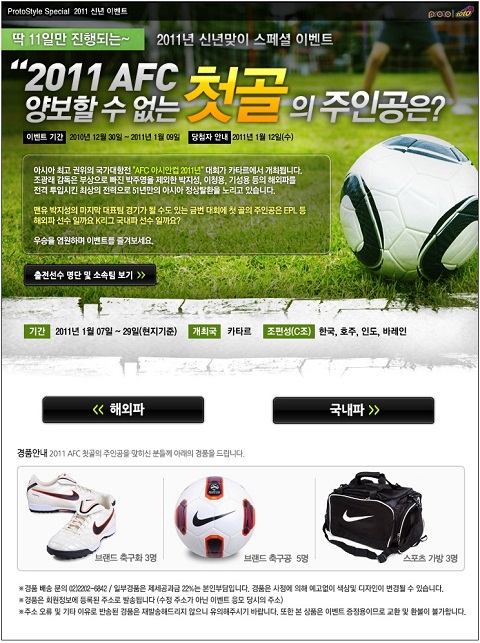 지난 12월 30일부터 단 11일간만 진행되는 ‘2011 AFC 양보할 수 없는 첫 골의 주인공은’ 이벤트는 51년 만에 아시안컵 우승에 도전하는 우리 국가대표팀을 향한 국민들의 응원과 관심을 더욱 높이기 위한 취지로 마련됐다.