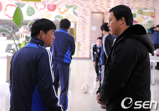 '수원의 프랜차이즈스타' 이운재가 전남과 최종 계약만 남긴 채 3일 오전 경기도 화성시 삼성반도체 내 수원삼성 클럽하우스를 찾아 수원 윤성효 감독과 인사를 나누고 있다.