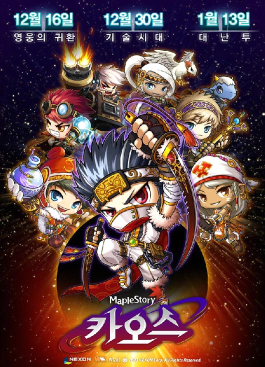 메이플스토리는 올 겨울 카오스 업데이트가 단행된 이후 지속적으로 상승세를 보이고 있으며, 지난해 12월 16일 최고 동시접속자수 28만 명을 시작으로, 12월 25일 36만 4천 명, 1월 1일 38만 명을 돌파하는 등 지난 여름 ‘빅뱅’업데이트 이후 기록한 온라인게임 최고 기록인 41만 6천 명에 버금가는 성과를 기록 중이다.