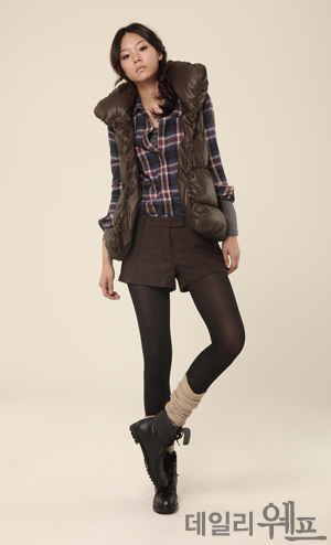 최근 구스다운 컬렉션을 선보이는 프론트로우 역시 기본 컬러의 베스트에 이너로 체크 셔츠와 쇼트 팬츠, 워머를 매치하여 개성 있는 스타일이 돋보이는 패딩 베스트를 선보였다. 최근 핫 이슈인 발열 소재의 레깅스와 심플한 모직 소재의 쇼츠를 매치해 트렌디한 룩을 연출하며, 여기에 워커나 양털 부츠를 매치하면 시크하고 다리가 늘씬해 보이는 효과를 준다.