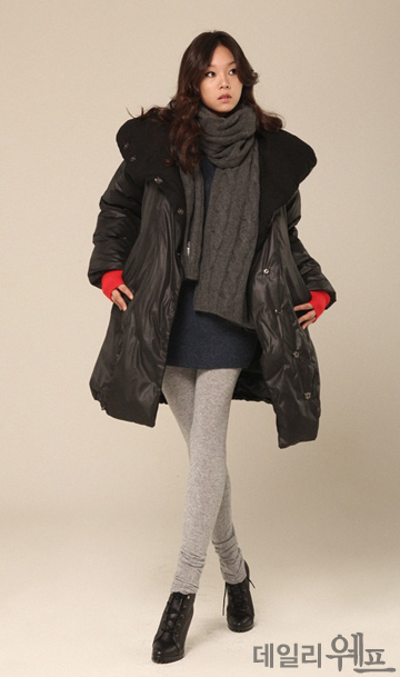 카라 모양을 독특한 윙카라로 제작하여 레깅스와 암워머, 머플러를 활용하면 편안하고, 세련된 스타일을 살릴 수 있다.