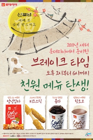 [이브닝신문/OSEN=이성원 기자] QSR브랜드 롯데리아가 2011년 신묘년을 맞아 인기 디저트 메뉴를 1000원에 선보인다.