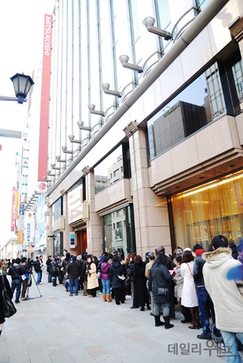 <긴자 미츠코시백화점 앞에서 후쿠부쿠로 위해 새벽부터 행사를 기다리는 행렬>
