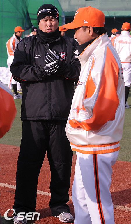 시무식을 마친 후 류현진과 송진우 투수코치가 이야기를 나누고 있다. /soul1014@osen.co.kr