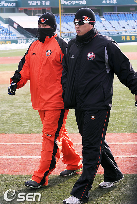 류현진과 김태균이 훈련을 마치고 들어가고 있다. /soul1014@osen.co.kr