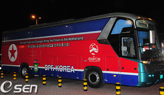 북한 대표팀을 기다리는 버스에 인공기와 함께 "투지와 용기로 승리해 우승컵을 조국의 품으로!"라는 문구로 적혀있다. /rumi@osen.co.kr