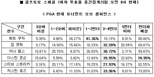 지정 선수별 1라운드 예상 스코어에서 짐 퓨릭(32.20%), 어니 엘스(30.72%), 더스틴 존슨(39.95%), 스티브 스트리커(27.93%), 저스틴 로즈(33.96%)가 3~4언더를 기록할 것으로 집계됐다. 매트 쿠차(41.36%)는 1~2언더가 예상됐다.