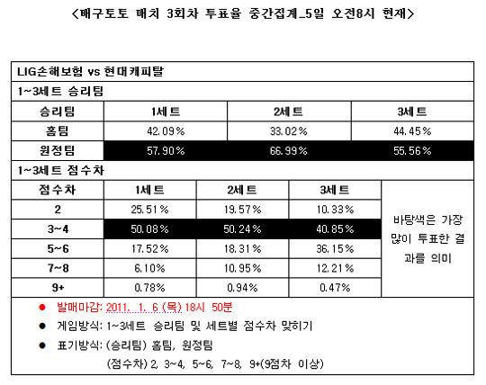 2010-11시즌 프로배구 대상 배구토토 매치 3회차 중간집계 결과