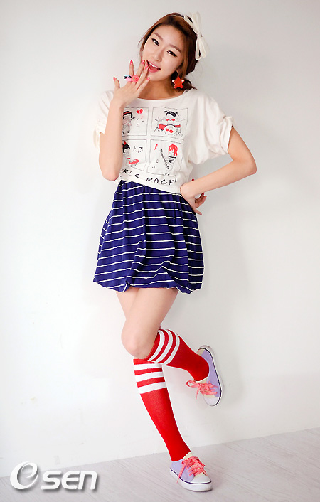 ▲허스키 보이스 매력 리더 비키 “전체적으로 상큼한데요, 아주 살짝 섹시함도 묻어날 거예요. 짱구춤과 인어공주춤이 있는데요. 짱구춤은 짱구처럼 엉덩이를 귀엽게 털어주는 춤이고요. 인어공주 춤은 인어공주처럼 누워서 살랑살랑 유혹하는 춤이에요. 남자분들이 밤에 잠을 잘 못자지 않을까 걱정이에요.(웃음)