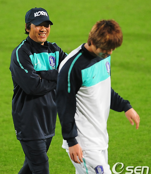 조광래 감독이 기성용을 보며 환하게 웃고 있다. /rumi@osen.co.kr