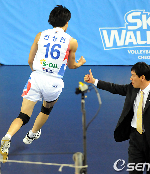 2세트 현대캐피탈 문성민의 공격을 대한항공 진상헌이 블로킹 하자 신영철 감독이 엄지손가락을 들어보이고 있다. /spjj@osen.co.kr