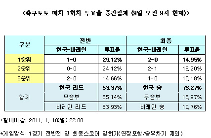 체육진흥투표권 수탁사업자인 스포츠토토(www.sportstoto.co.kr)는 오는 11일(화) 오전 1시 15분(한국시간) 카타르 알 가리파 스타디움에서 열리는 2011 AFC 아시안컵 한국과 바레인의 조별예선전을 대상으로 한 축구토토 매치 1회차 투표율 분석 결과 국내 축구팬들은 한국의 승리를 점치고 있는 것으로 나타났다고 밝혔다.