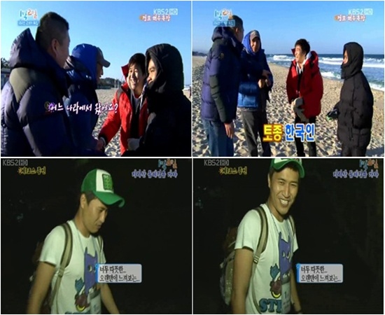 지난 9일 방송된 KBS 2TV 주말 버라이어티 '해피선데이-1박2일'의 한 장면이다. 김종민의 입수는 이날 방송분의 하이라이트 중 하나였다. 경포대 해수욕장에 도착한 김종민은 자신의 외국인 친구 쏘완에게 밥을 먹이겠다는 일념으로 살신성인(?)했다.