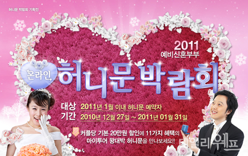 [데일리웨프/OSEN=정현혜 기자] 마이투어 에서는 2011년 1월 31일까지 2011년 예비신혼부부를 위한 특별 온라인 허니문 박람회를 진행한다.