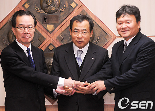 일본 시모다 쿠니오 사무국장, 이상일 사무총장과 대만 웨인 리 사무총장이 포즈를 취하고 있다 /soul1014@osen.co.kr