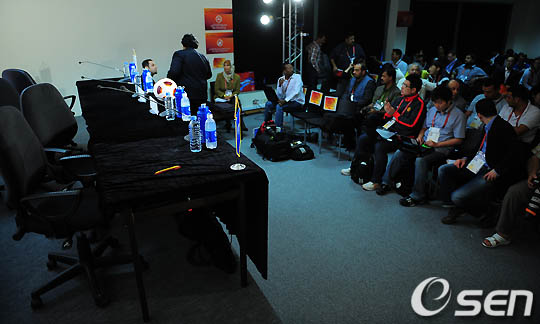 2011 아시안컵에 출전하는 북한 축구대표팀이 10일 오후 5시 30분(한국시간) 카타르 도하의 MMC 센터 회의실에서 아랍에미리트연합과 첫 경기를 앞두고 기자회견을 가질 계획이었으나 취재진이 다 모여있는 가운데 북한이 일방적으로 시간을 변경, 두시간 후에 기자회견을 한다고 전해졌다. /rumi@osen.co.kr
