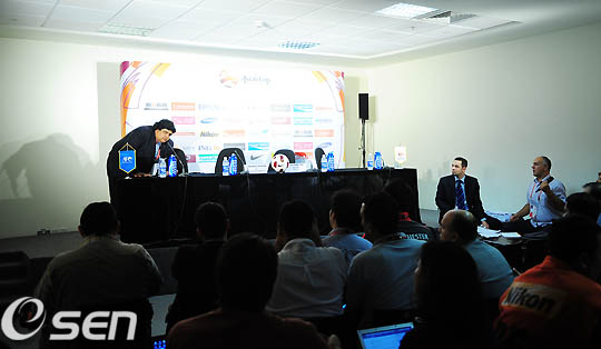 AFC 관계자가 북한의 일방적인 기자회견 시간연기를 통보하고 있다./rumi@osen.co.kr