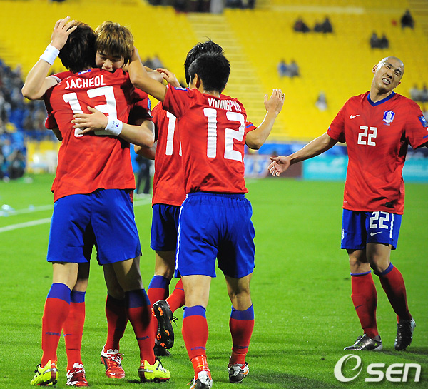 전반 40여분 구자철이 골을 넣고 동료들과 기쁨을 나눌때 뒤에 있는 차두리가 뭔가 아쉬운 표정을 짓고 있다. /rumi@osen.co.kr