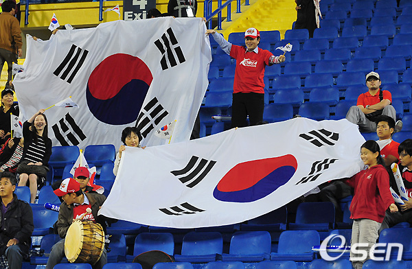 한국 교민들이 대형 태극기를 들고 응원을 하고 있다. /rumi@osen.co.kr