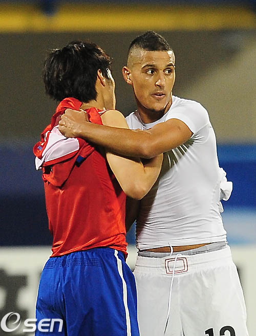 경기를 마치고 골을 넣은 바레인 아이쉬와 박지성이 유니폼을 교환하며 포옹을 하고 있다. /rumi@osen.co.kr