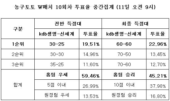 체육진흥투표권 수탁사업자인 스포츠토토의 공식 온라인 발매사이트인 베트맨(www.betman.co.kr)은 오는 12일 오후 5시 구리 실내체육관에서 열리는 2010-2011 여자프로농구 kdb생명-신세계전을 대상으로 한 농구토토 W매치 10회차 투표율 중간집계 결과, 전체 참가자의 45.21%가 홈팀 kdb생명이 원정팀 신세계를 상대로 우세한 경기를 펼칠 것으로 전망했다고 밝혔다.